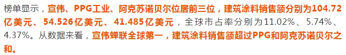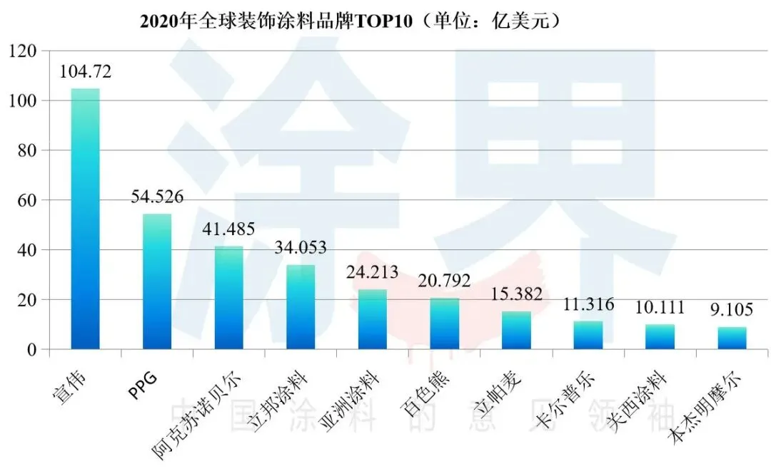 立邦涂料、亚洲涂料、百色熊、立帕麦、卡普乐尔、关西涂料、本杰明摩尔分别位居第4-10位,销售收入分别为34.053亿美元、24.213亿美元、20.792亿美元、15.582亿美元、11.316亿美元、10.111亿美元、9.105亿美元。