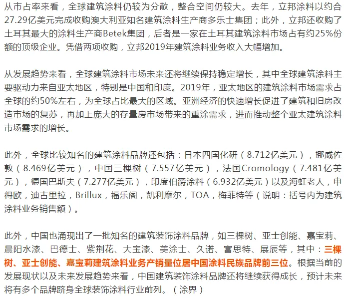 根据涂界监测的数据显示,2019年全球涂料总产量约9660万吨,销售收入约1977亿美元,其中:2019年全球建筑/装饰涂料产量为5313万吨,年销售收入为950亿美元。全球装饰涂料品牌20强去年累计销售收入为394.796亿美元,占全球建筑涂料比例为41.56%。