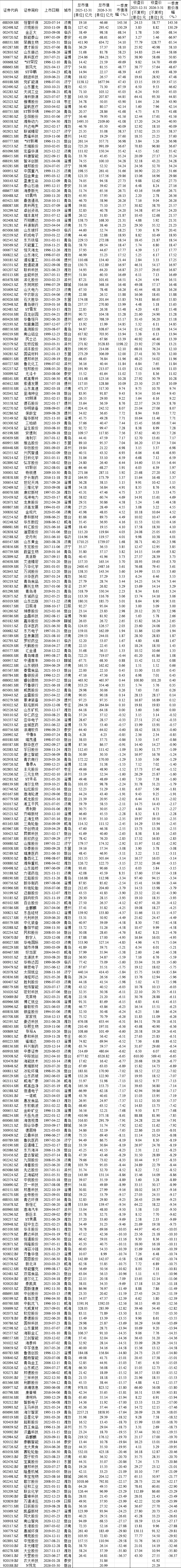 2026Q1山东上市公司市值与股价表现