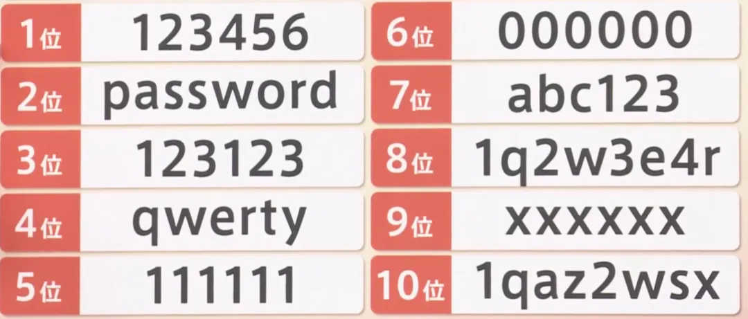 据情报通信公司Soliton Systems发布的数据,“日本人最容易泄露的密码排行榜”第一名是“123456”,而它在“NordPass榜单”中也排名第一,可以说是国内外用户使用最多的密码,甚至可以说是全人类提起密码时最先想到的一串数字。第二名则是“password”。