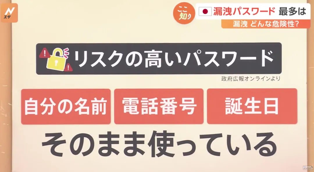 那什么样的密码泄露风险较高呢?据日本政府宣传网站指出:用自己的名字、电话号码、生日信息作为密码的风险很高,要务必小心。