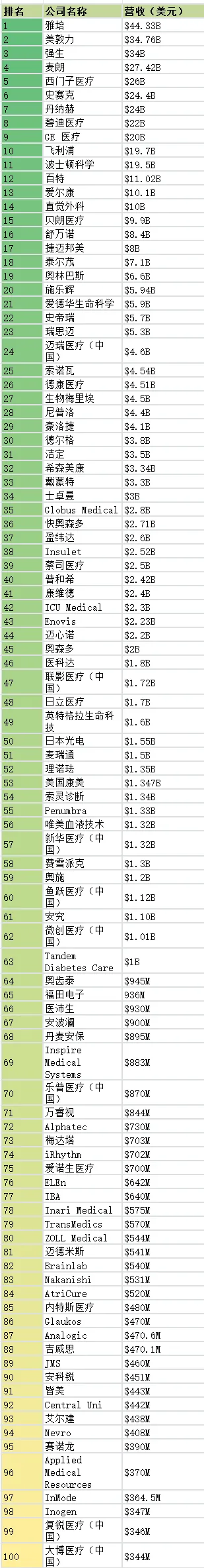 全球医疗器械公司100强