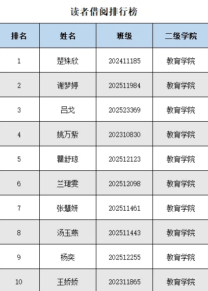 阅读是心灵的远行,也是知识的积淀。感谢每一位热爱阅读的你,让图书馆成为校园中最温暖的精神家园。希望在下个月的榜单中,看到更多新面孔、新班级、新学院的精彩表现!