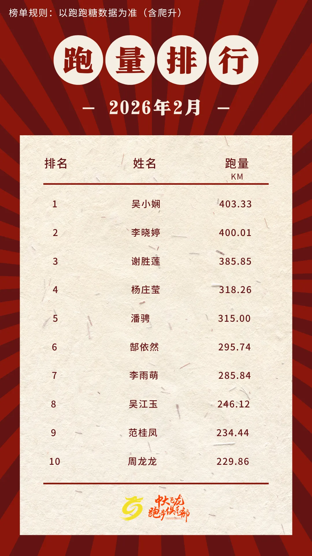 (数据说明:本榜单依据跑跑糖统计,包含爬升数据,真实反应每位飞龙er们的综合训练量)