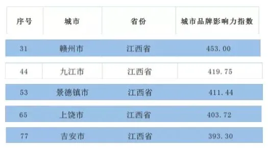 近日,中国城市品牌评价项目组、人民日报社属中国城市报社依据国际标准和国家标准,运用国家部委近两年的相关数据,对全国293个地级市进行标准化分析,最终计算出各城市品牌综合影响力指数(不含省会以上城市),发布前100名城市名单。江西省有5个城市入选榜单,九江名列第44位。