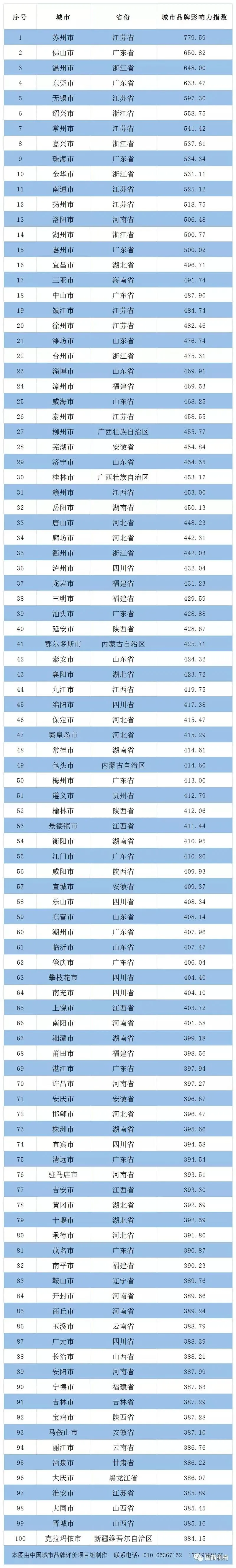 中国地级市百强品牌城市榜单