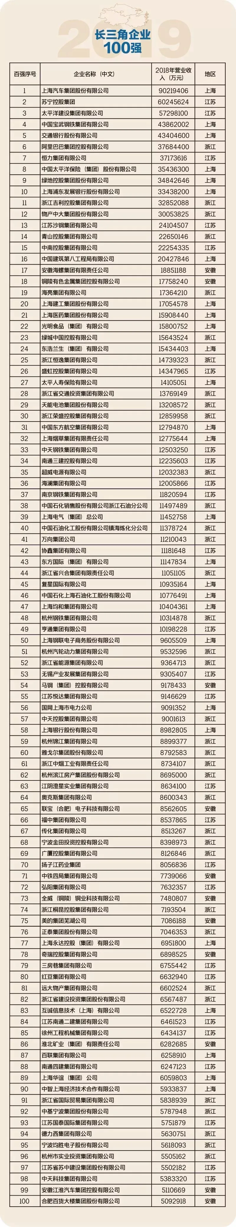 2019长三角企业百强榜单