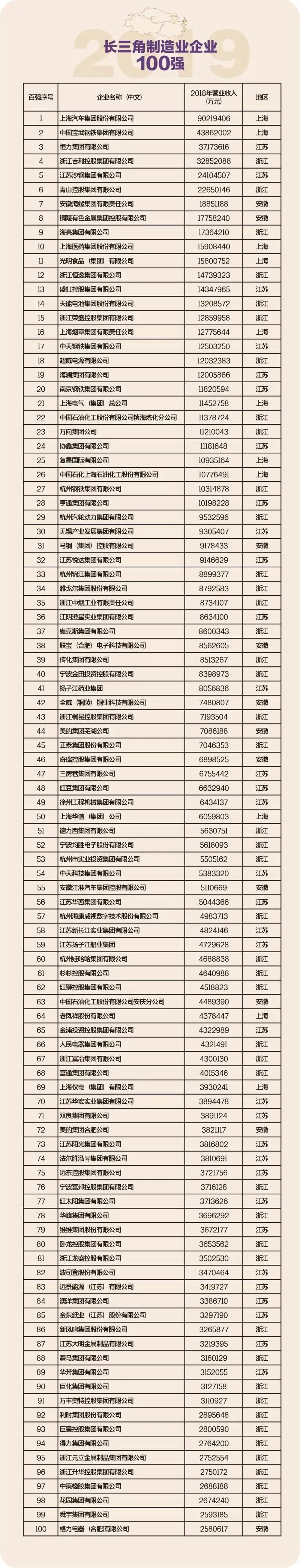2019长三角制造业企业百强榜单