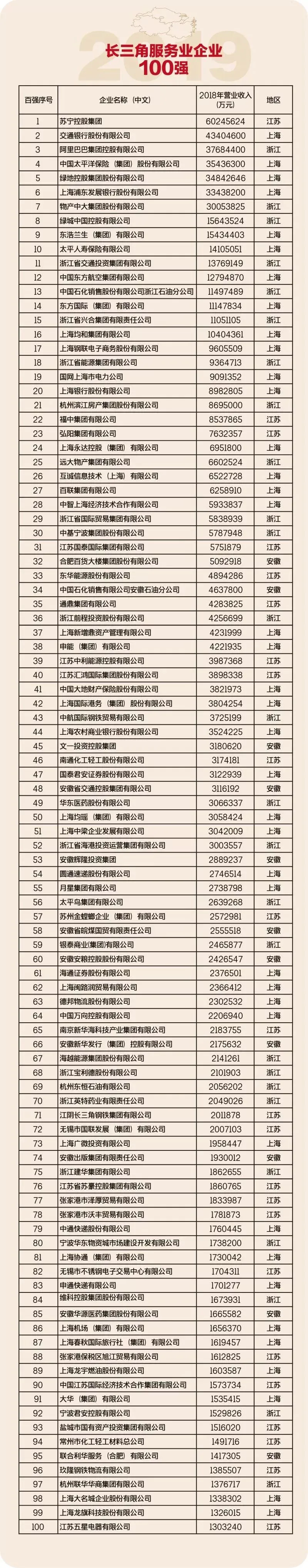 2019长三角服务业企业百强榜单