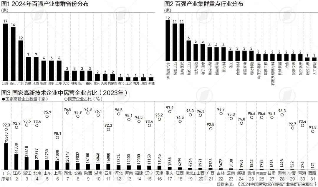 近日,中国民营经济研究会与上奇数科联合发布《2024中国民营经济百强产业集群研究报告》(下称“报告”)。报告显示,百强集群汇聚了180.1万家民营企业,贡献了近5万家国家高新技术企业、3000家国家专精特新“小巨人”企业以及1800家上市公司。2024年百强集群中民营企业融资总额超4000亿元,占比近50%。