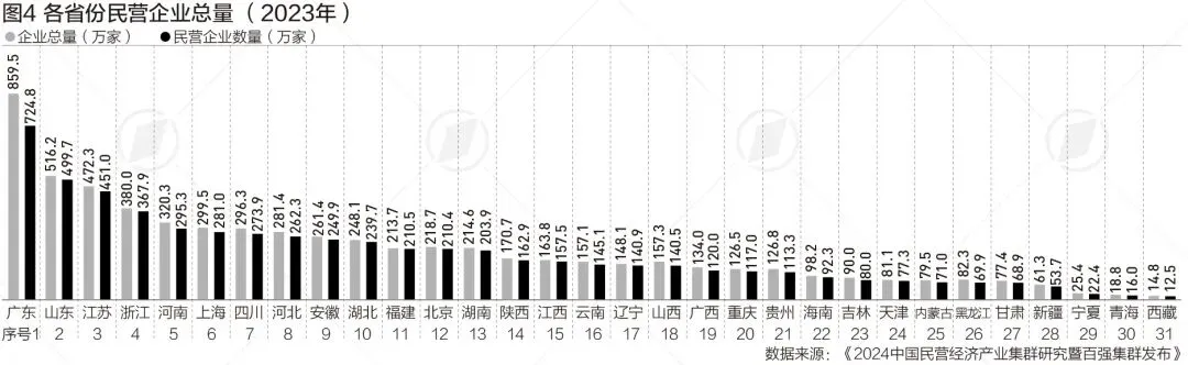 根据报告,东部地区民营企业超3000万家,占比达53.6%;中部地区占比21.72%、西部占比19.8%;湖北、湖南、陕西等中西部省份,民营企业数量同比增长超过10%。广东民营企业数量高居第一,超720万家;山东省超500万家;江苏、浙江位列第三、第四,均超过300万家。