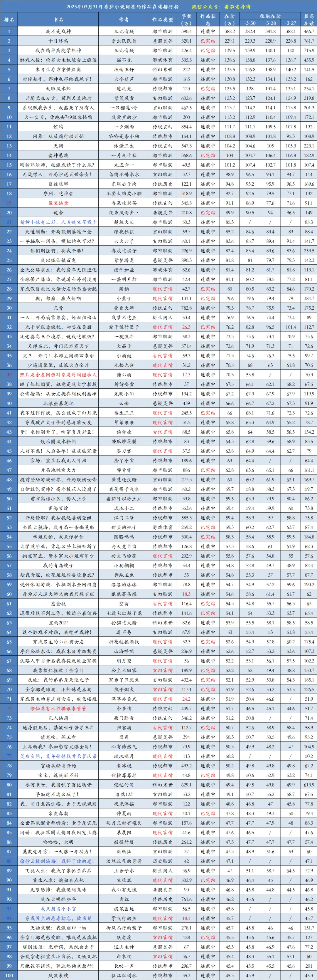 3月31日番茄在读前一百排行榜如下: