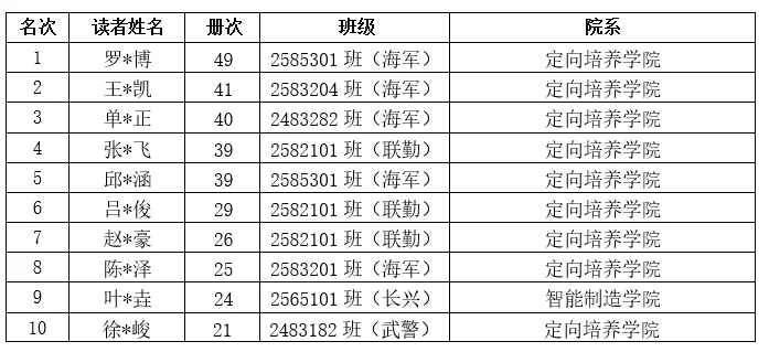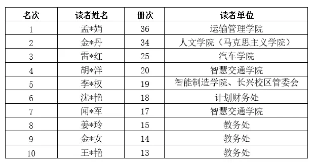 分院借阅数、入馆数和教工、学生借书排行榜将作为本年度“领航者悦 读”先进集体及个人评选的参考依据。