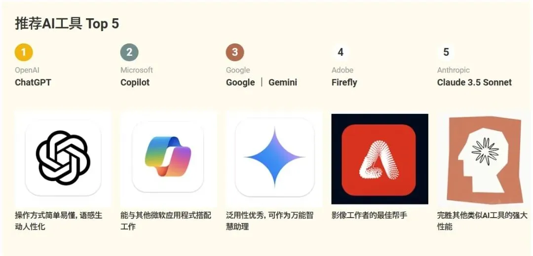 AI工具 推荐排行榜掌握了挑选时的各项要点后,接下来将以推荐排行榜的形式介绍AI工具。