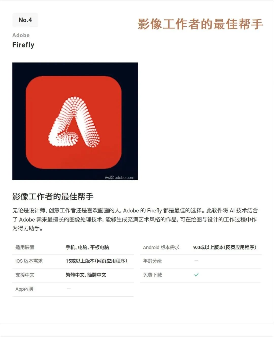2、想用AI绘图有Midjourney、FireflyMidjourney、Firefly 是目前最专业的 AI 绘图软件,无论是一般用户还是专业创作者都能满足需求。如果想活用 AI工具来绘图,目前是以 Midjourney 及 Adobe Firefly 最为知名。 其中 Midjourney 的使用自由度高,它是透过用户的电脑显示卡运算,只要套用内建丰富的模板,即可轻松改变成油画风、写实风等各种风格,还能自行输入数据训练、打造出特定画风的模型,算是门槛较高的专业工具。而 Adobe 开发的 Firefly 则尚在测试阶段,目前有提供会员免费使用,不仅具备专业性,操作起来也相当直觉且应用广泛,是专业创作者可以持续关注的工具。目前视频创作领域是以主流软件直接扩充 AI 功能为主,像是达芬奇、Premiere 和威力导演能够自动剪接、一键切换背景或加特效; Photoshop 和 Lightroom 则借由 AI 扩增图像,可自动填补背景或更换对象。 此外,现在正在开发中的新技术 Sora 期望透过 AI 创作整部影片,有望成为未来最强的生成视频工具。 至于已上市的suno则不需任何音乐知识,仅透过文字描述即可创作词曲。