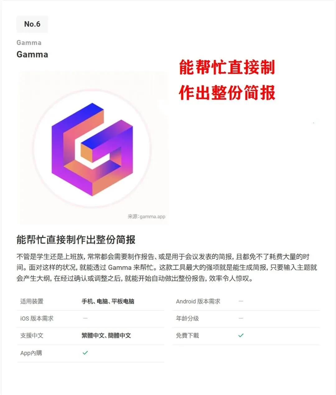 4、学生族、上班族可活用Gamma与Vocal、Good tape增加效率Gamma 可以快速制作 PPT 简报,而 Voca、Good tape 能够将录音档转为逐字稿,大幅提升工作效率。制作课堂报告或工作简报时有不少繁复的作业,为此,不少研发公司也针对文书处理推出相关 AI 工具。