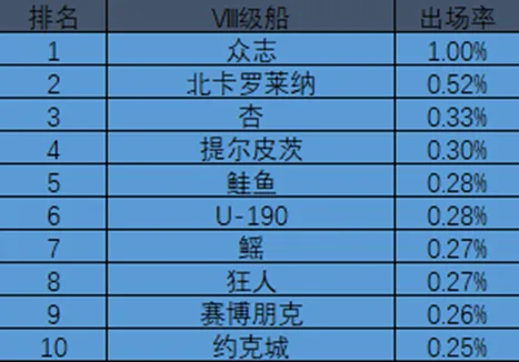 Ⅷ级船出场率排行