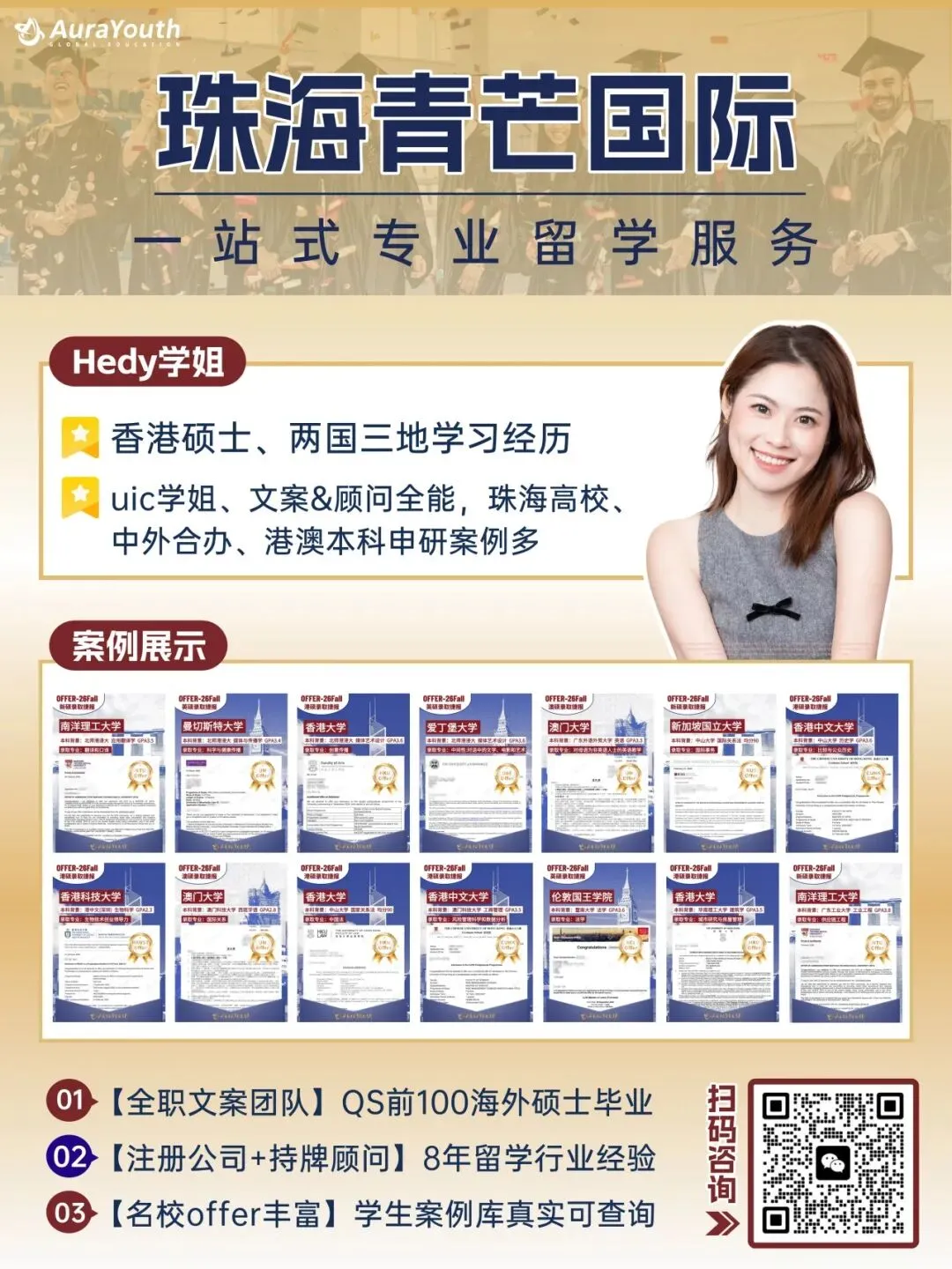 服务板块覆盖香港初高中插班、海外中学申请,到全球本科、硕士、博士名校升学全学段、全周期服务。我们秉承 “专业赋能,成就青年” 的服务理念,坚决拒绝流水线模板化申请,为有志于海外升学的广大学子提供可预见的全周期升学成长方案,消解升学路上的焦虑与迷茫,助力每一位年轻人在全球舞台绽放专属光芒。