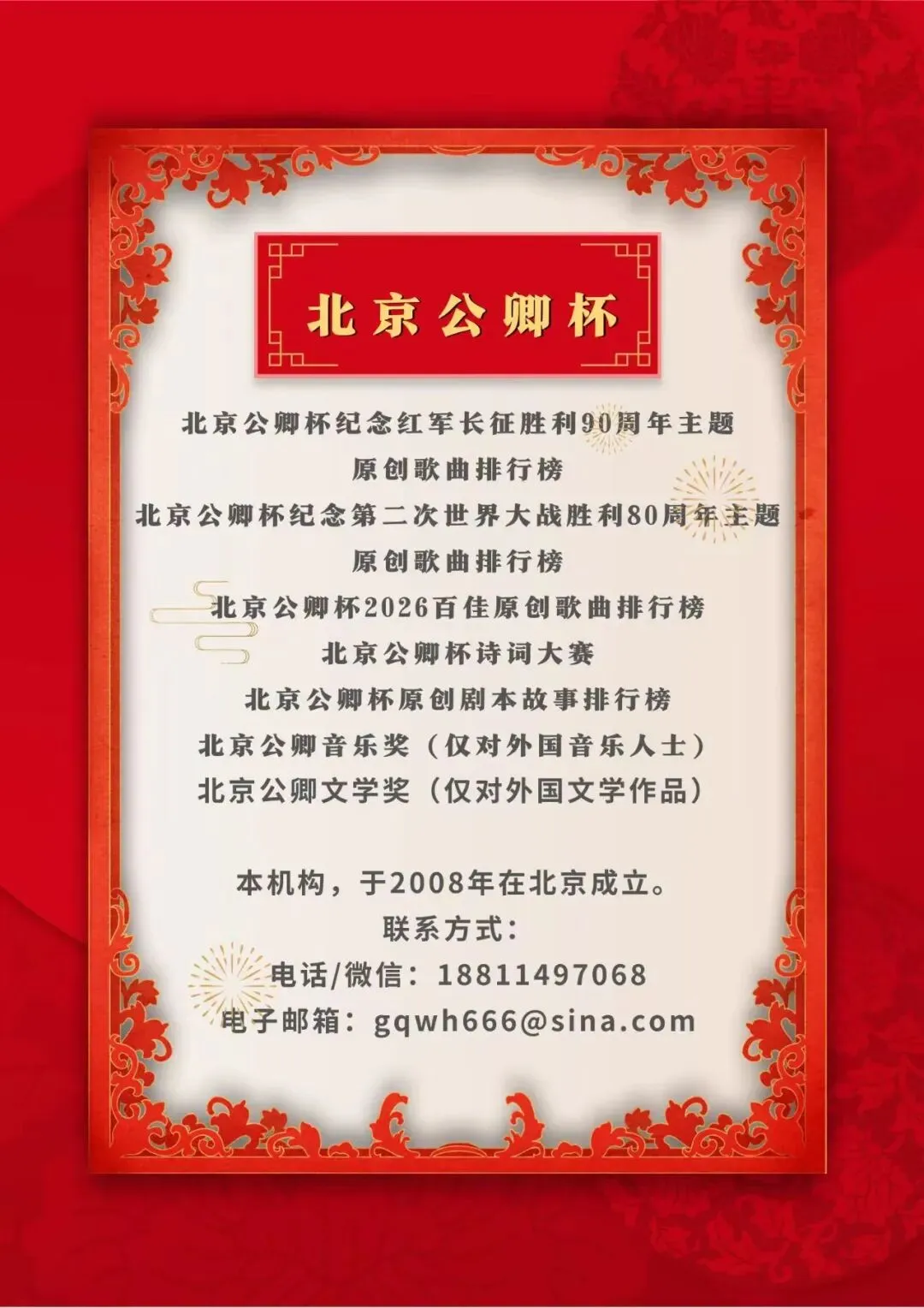 北京公卿杯音乐艺术平台,主要开展:原创歌曲、歌手、演唱、诗词与朗诵作品、舞蹈模特、合唱、艺术表演、艺术创作、书法、书画等文化艺术活动,尤其是原创歌曲、歌手活动为主。