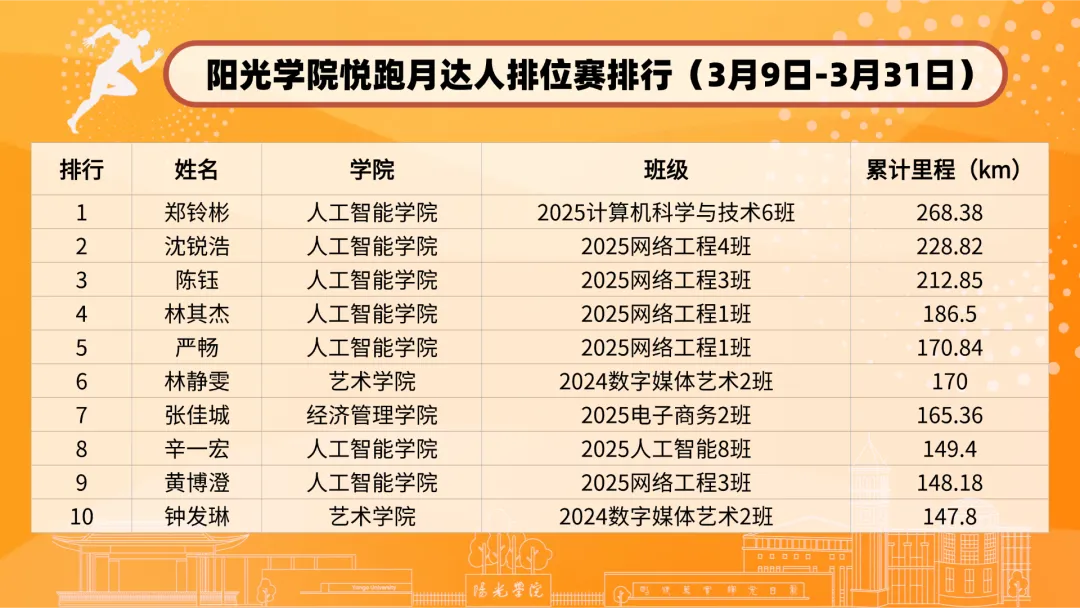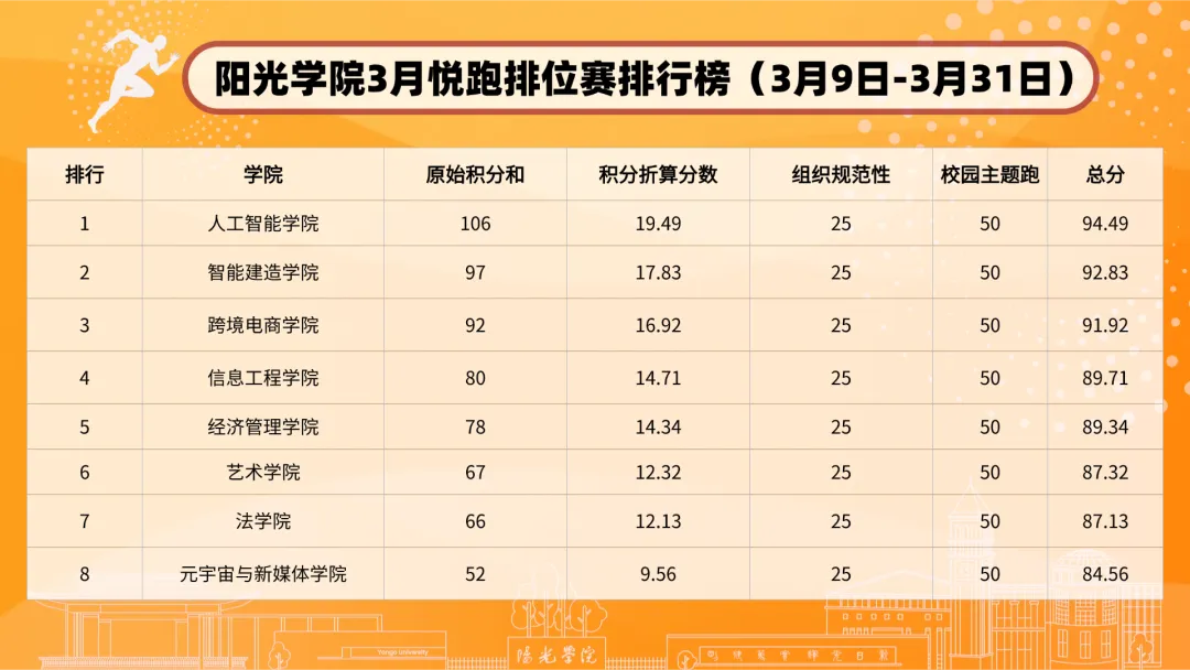 三月“学院悦跑排位赛排行榜”、“悦跑先进班级”及“悦跑月达人”公示