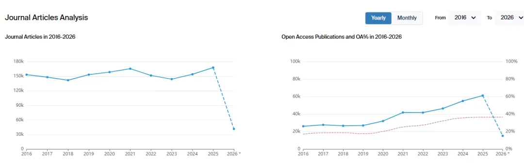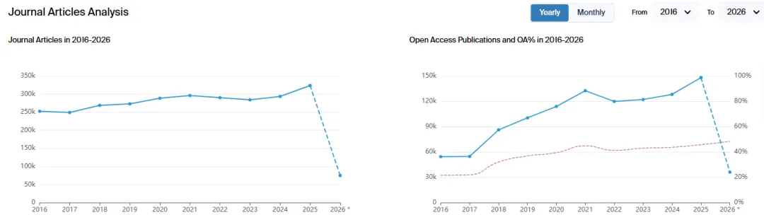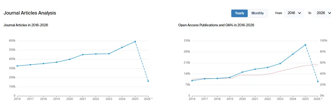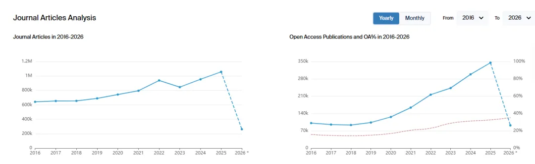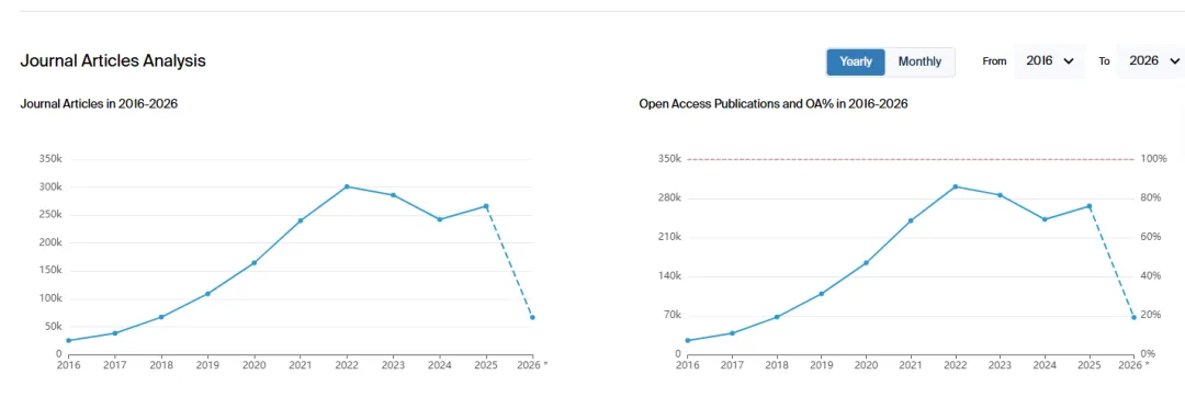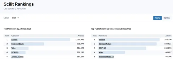 从Scilit 数据库出版商2025年排名中可以看到,在整体发文数量排名中,第一位为Elsevier,发文数量达到100万篇,Springer Nature以接近60万篇排名第二,Wiley32万排名第三,第四位为MDPI,达到26万6千,Taylor & Francis, 16万7千排名第五。在开放获取(OA)排名中Elsevier,Springer依然保持前二的位置,第三则是MDPI。(在2020--2023年, MDPI是OA发文数量第一大的出版商)