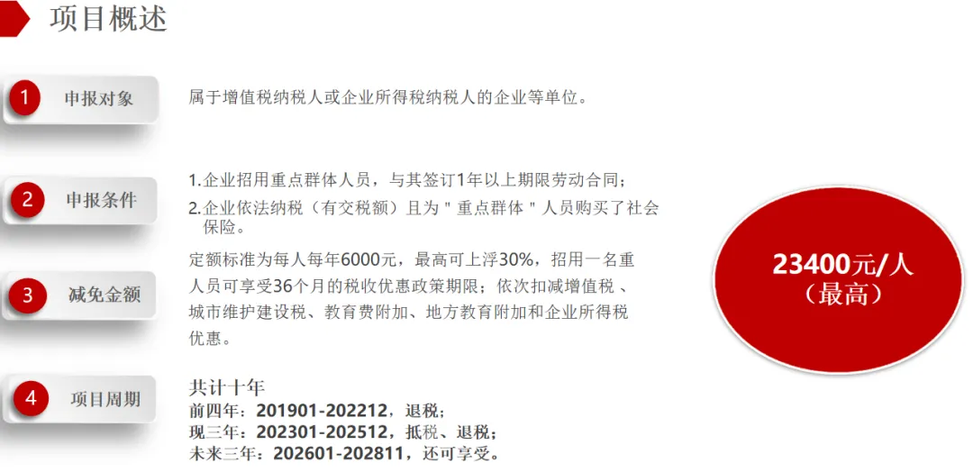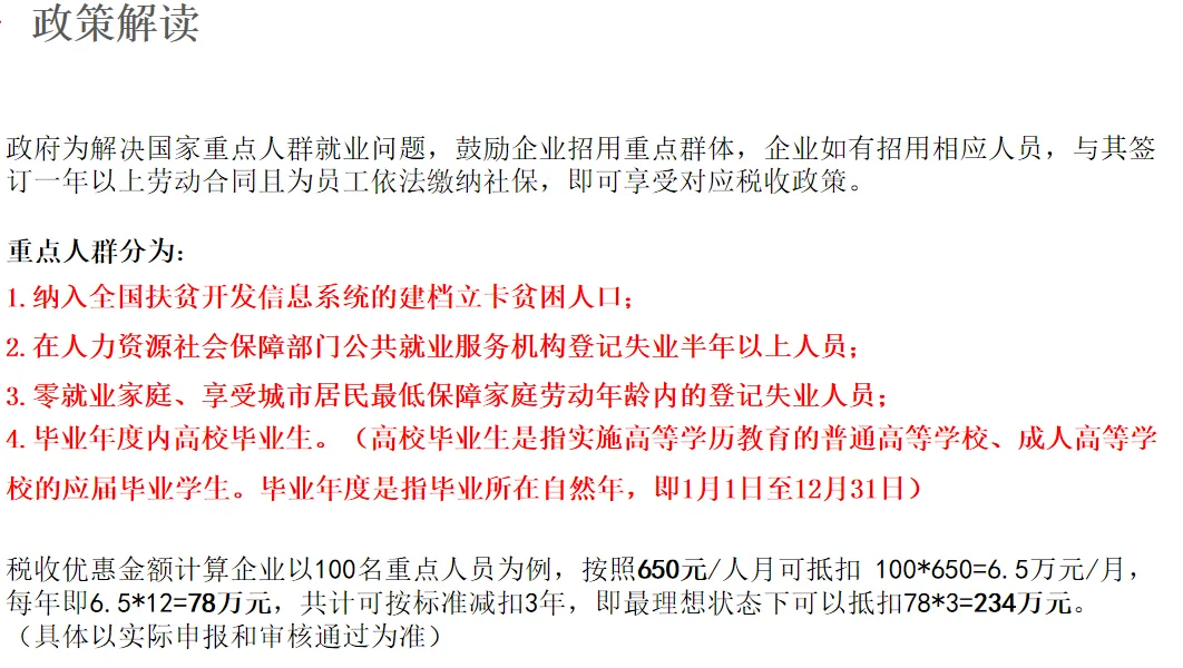 政府为鼓励企业招用重点人群就业补贴,7800元/年/人,累计3年23400元,上不封顶。(如100人符合:100*23400元=234万)