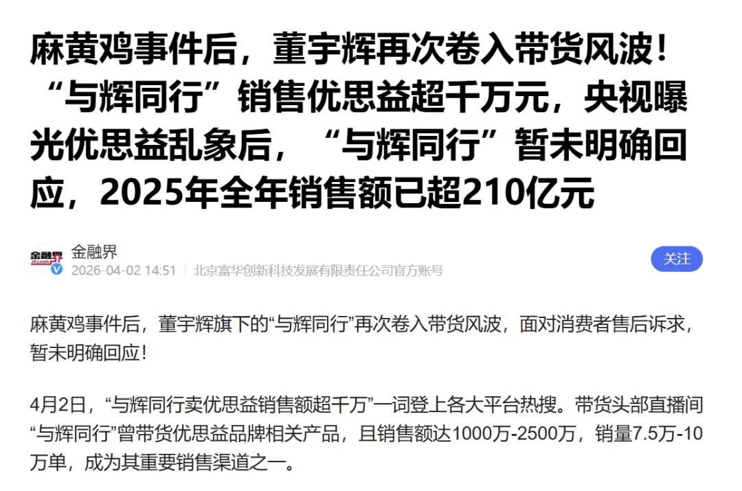 补充事实:4月1日、2日,“与辉同行”直播间正常开播。主播未提及“澳洲优思益”事件。4月2日晚的致歉声明以客服渠道发布,非董宇辉个人账号。