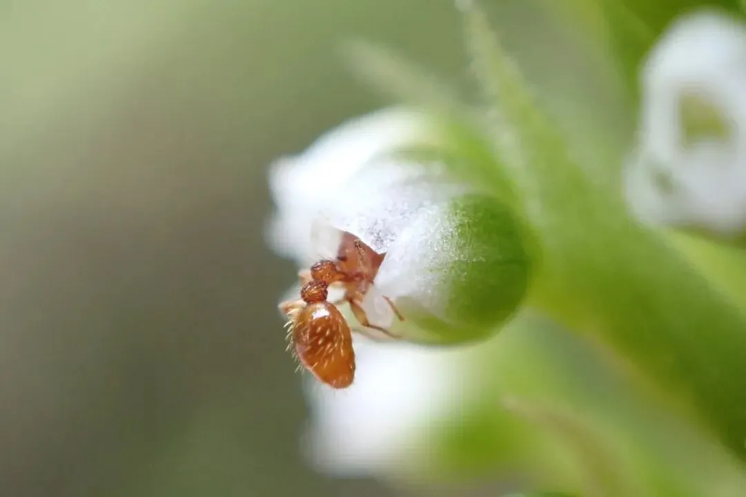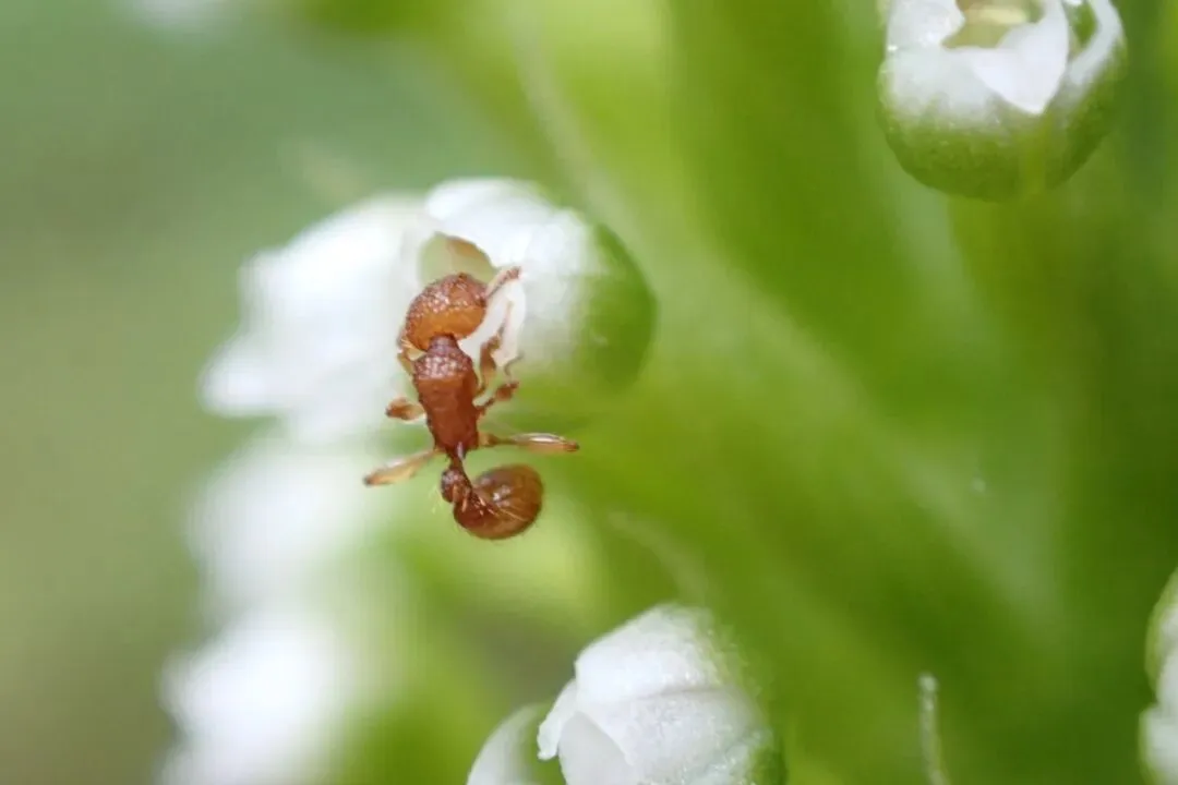 一只蚂蚁来了,小脑袋努力地探进去,真为它捏把汗啊,半个身子悬空在外面,不会掉下来吧?