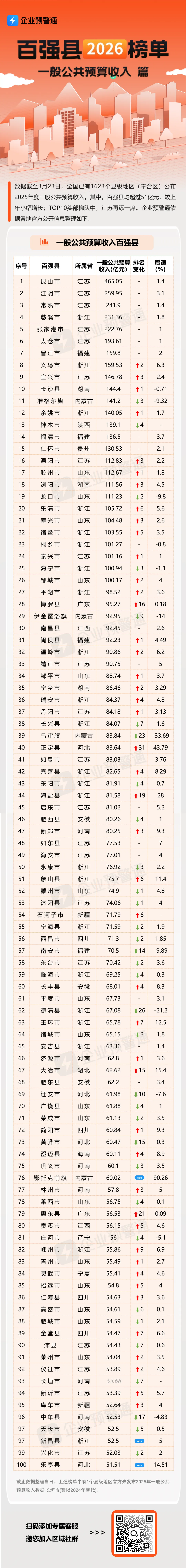 浙江:慈溪(第4)、义乌(第8)、乐清(第20)表现优异。特别是义乌,排名上升2位,显示出商贸流通业带来的强劲现金流。福建:晋江(第7)、福清(第14)稳居前列,民营经济活跃度高,为财政收入提供了坚实支撑。三、增速与排名变化:资源型城市的“冰火两重天”