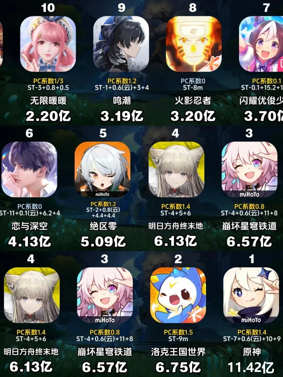 终末地这次倒是稳,虽然不是前三但也没掉出前列。鹰角这公司挺有意思的,从来不搞什么大新闻就是老老实实做内容。付费点主要靠皮肤,角色本身不逼氪玩家黏性高得离谱。有贴吧老哥调侃说鹰角看腾大哥卖付费皮肤赚翻了,估计也在琢磨是不是该学学。不过以鹰角的调性,大概率还是继续走自己的慢节奏路线。反正流水这东西看看就好别太当真,游戏好不好玩自己上手才知道。
