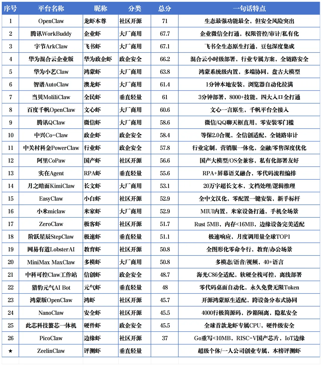 以下为27个平台(含评测虾ZeelinClaw)按加权总分的统一排名