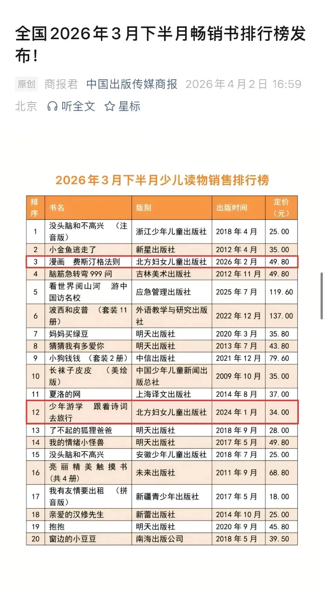 2026年4月2日,中国出版传媒商报公布了全国2026年3月下半月畅销书排行榜发布,北方妇女儿童出版社两种图书上榜。