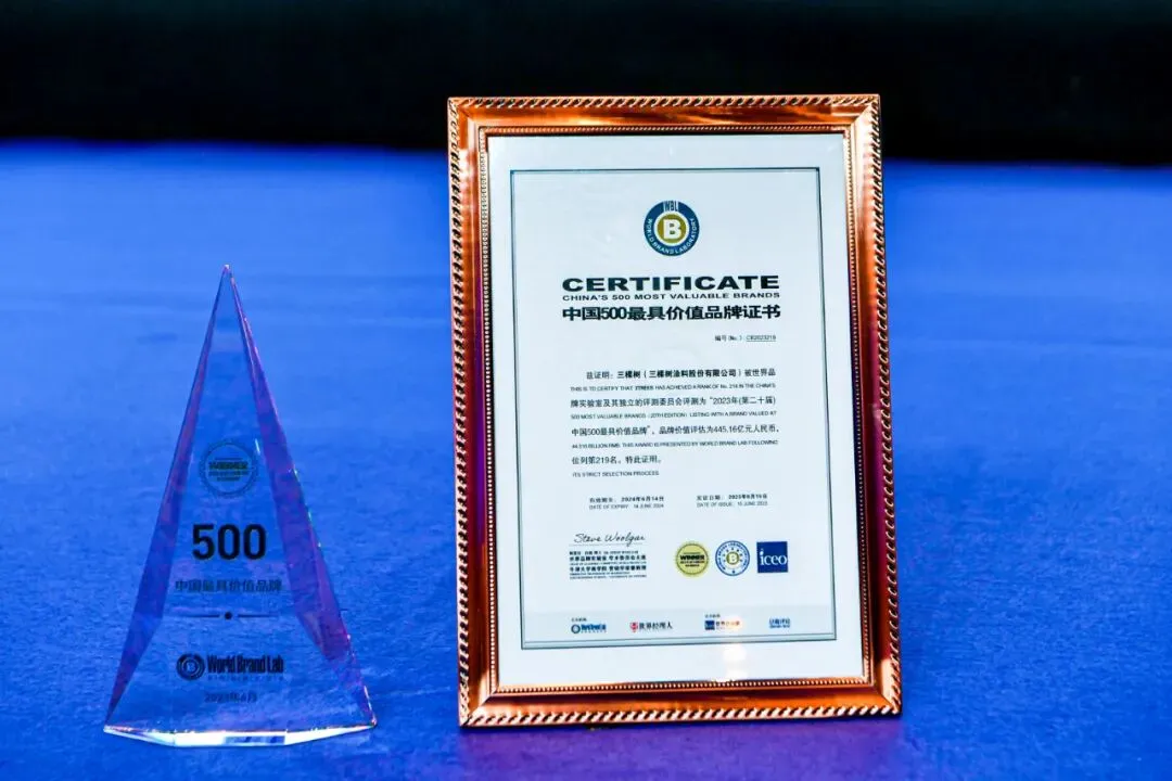 6月15日,由世界品牌实验室(World Brand Lab)主办的第二十届“世界品牌大会”在北京举行,会上发布了2023年《中国500最具价值品牌》分析报告。三棵树以445.16亿元的品牌价值,第17次荣登“中国500最具价值品牌排行榜”, 较去年增长64.48亿元,增幅达16.94%,持续蝉联涂料榜单第一名。