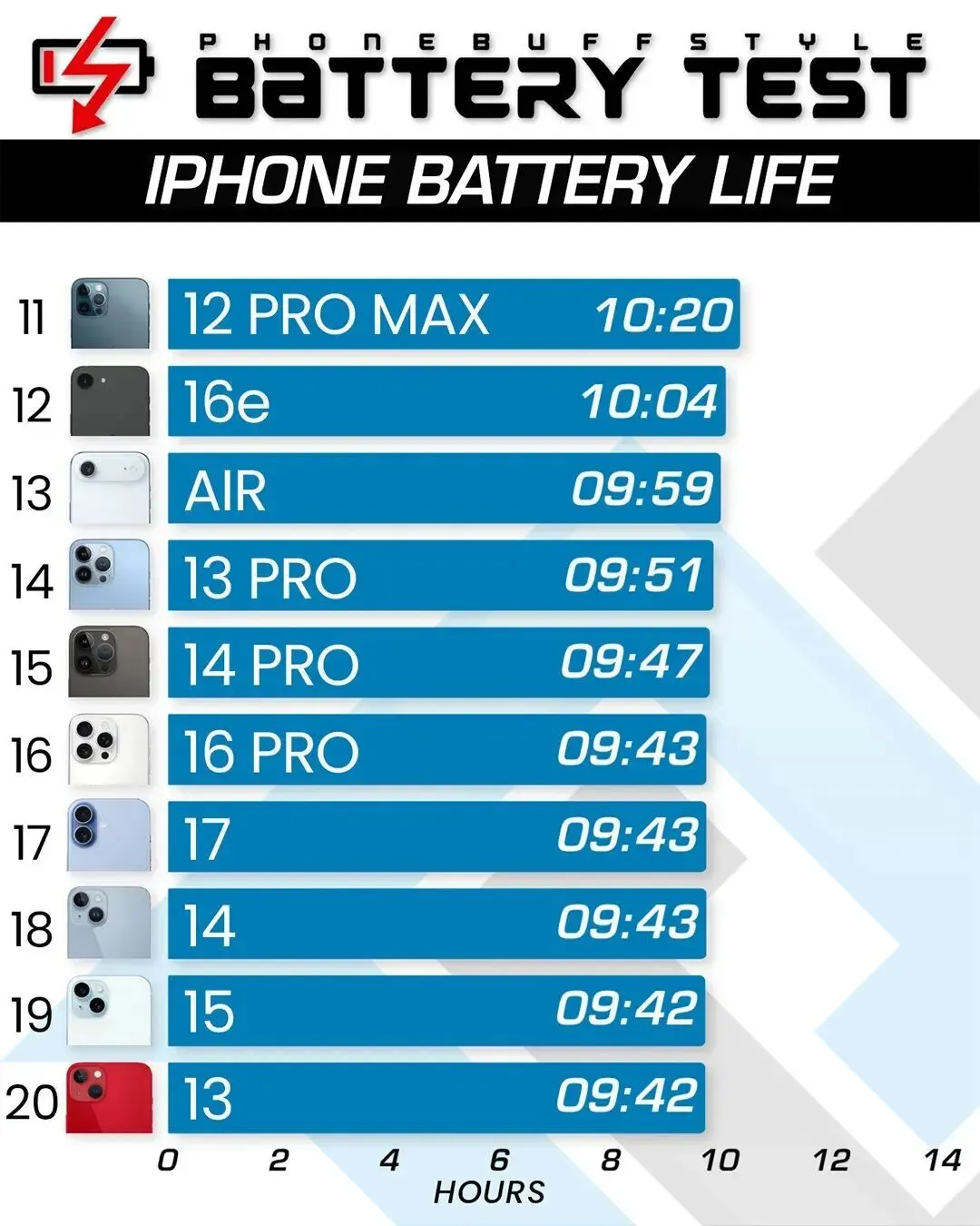 2025 年 11 月 29 日,外媒 PhoneBuff 发布了统一设置下的 iPhone 全系列日常续航实测榜单,全程模拟普通用户的真实使用场景,最终结果和多数人的固有印象大相径庭,多个排名颠覆了大家对苹果机型续航的认知。