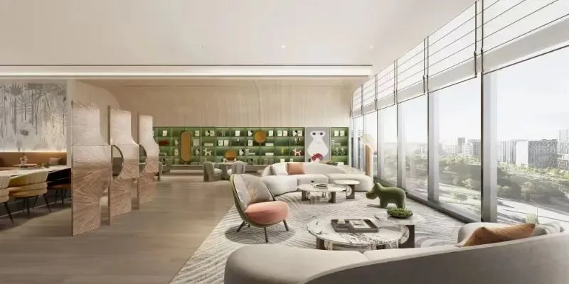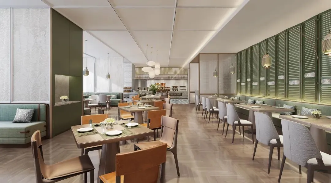 在设计理念上,项目以经典嘉庚风格为底蕴,饰以南洋风情为点睛之笔,通过现代设计语言将自然意境与在地文化融入每一处空间。步入大堂,艺术装饰“灵感之树”呼应品牌“和谐之境,自然共融”的理念,光影流转间塑造出自然意趣;水晶格栅屏风如鹭岛海面波浪起伏,绿色拱顶书架致敬南洋经典建筑元素,兔子艺术雕塑与绿植点缀其间,让自然、人文与艺术在此共生。餐厅以南洋骑楼为灵感,木质百叶窗搭配古铜金属配件,融汇地道闽南风味与中西式自助早餐,为住客开启一天的满足。
