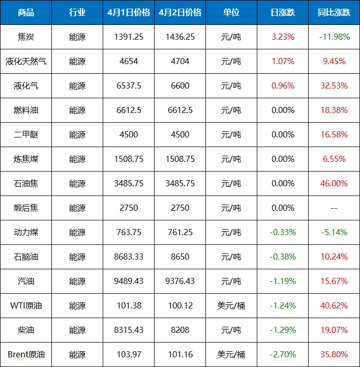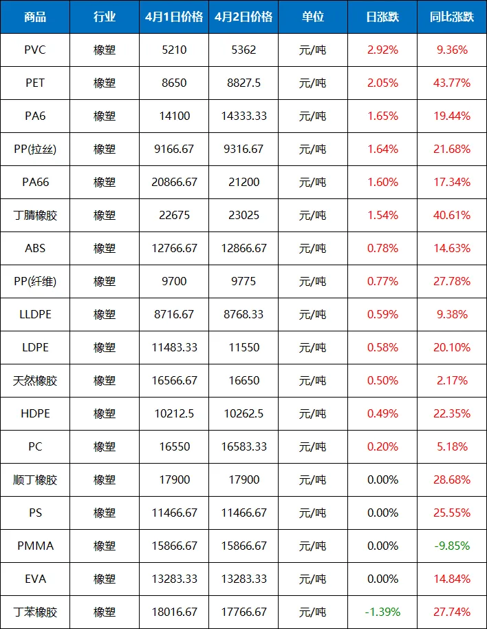2026年(4.2)橡塑大宗商品价格涨跌榜
