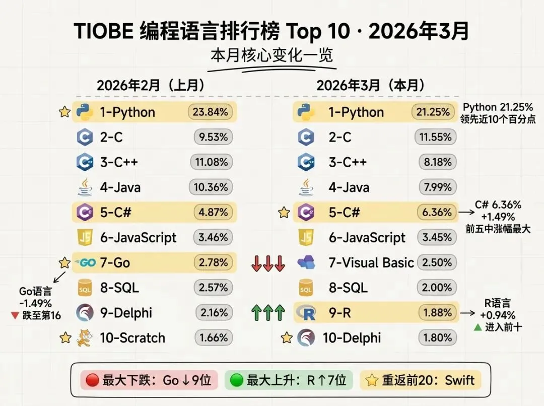 2026年4月初,TIOBE发布了3月份编程语言排行榜。本月最大的新闻不是谁登上了榜首——Python依然稳坐第一——而是一场悄然发生的"大洗牌":Go语言从第7位急跌至第16位,R语言从第16位飙升至第9位,Swift时隔多月重返前20。这场变动背后,折射出AI浪潮、数据科学热潮与系统编程格局的深层演变。