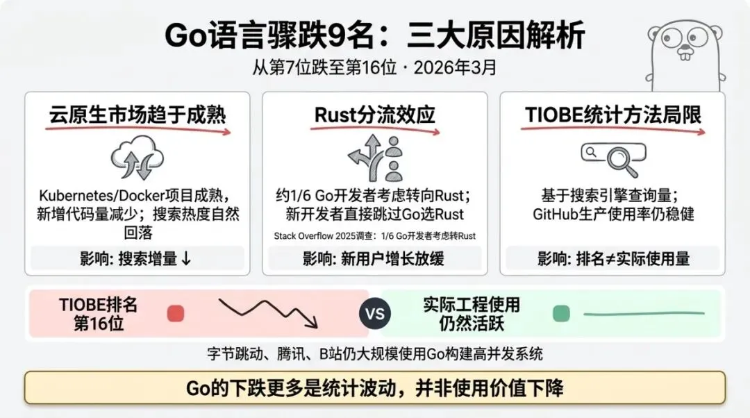 TIOBE统计方法的局限性: TIOBE基于搜索引擎查询量计算,Go的实际使用量远超排名所呈现的。GitHub数据显示Go在生产环境的采用率依然稳健,这次下跌更多是统计波动,而非真实使用衰退。