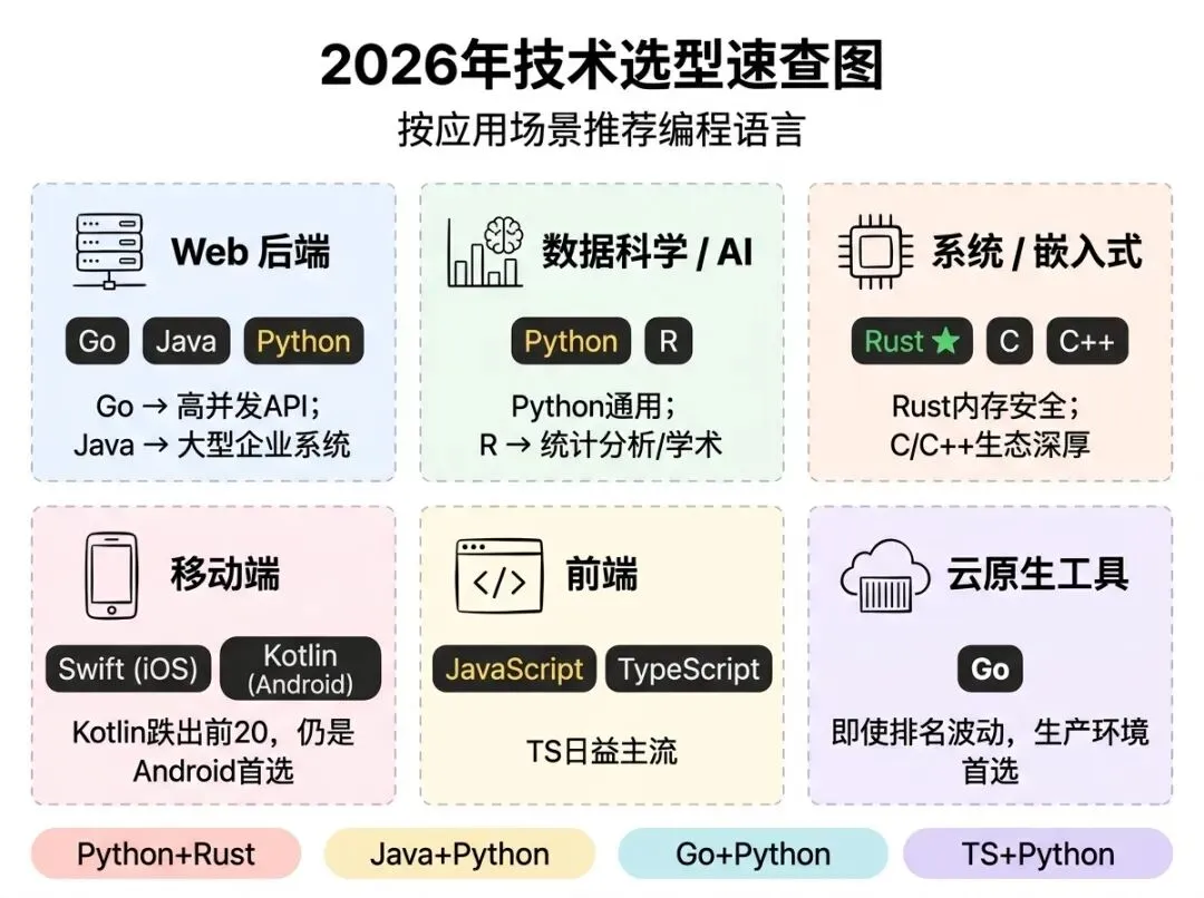 - 后端工程师:在Python或Java基础上,学习Go或Rust是当下最有竞争力的组合。