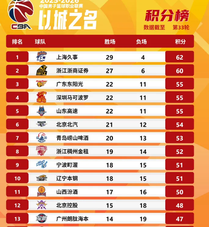 有意思的是由于北京首钢爆冷输给浙江稠州影响,导致其排名下降到第六名,广东宏远则下场拿下比赛的话就能够锁定季后赛了。如今排名前四的则依次是上海男篮、浙江广厦、广东宏远和深圳男篮。