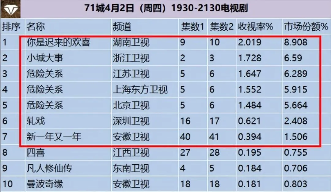 电视剧收视率排行榜,《危险关系》跌至第三,第一收视高达2.019%