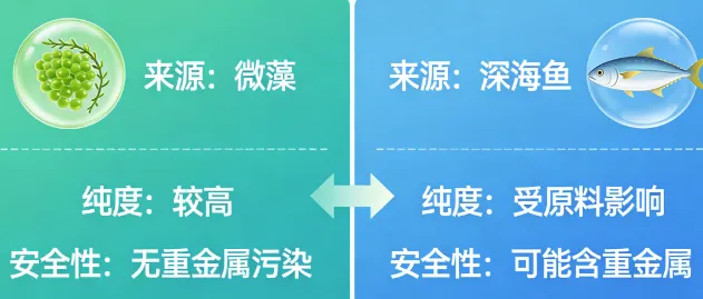 常见问题解答(FAQ) 问:鱼油DHA和藻油DHA该如何选择? 答:两者主要区别在于来源与纯净度。鱼油DHA来源于深海鱼类,可能伴随海洋重金属污染的风险,且通常含有一定量的EPA(二十碳五烯酸),EPA对于成人有抗炎作用,但对于婴幼儿的生长发育则需控制摄入量。藻油DHA直接来源于海洋微藻,处于食物链底端,几乎不含EPA,且通过封闭发酵培养可有效规避海洋污染,性质更纯净、稳定,气味也更温和。