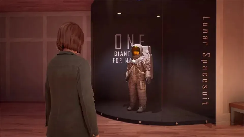 在天文台内,穿过楼梯后向右走。这样会来到一部电梯。在电梯附近,你能看到玻璃柜后面的宇航服。给它拍张照片。