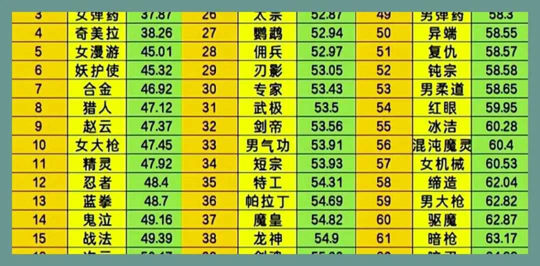而榜单越往后,二线梯队的人数就越多,一共39个职业。最有话题性的就是女气功和红眼这两个了。这些年女气功一直被很多玩家看好,有速度、爆发力强且生存能力也不错,但是这次只排到第18位,还是有点出乎意料的。