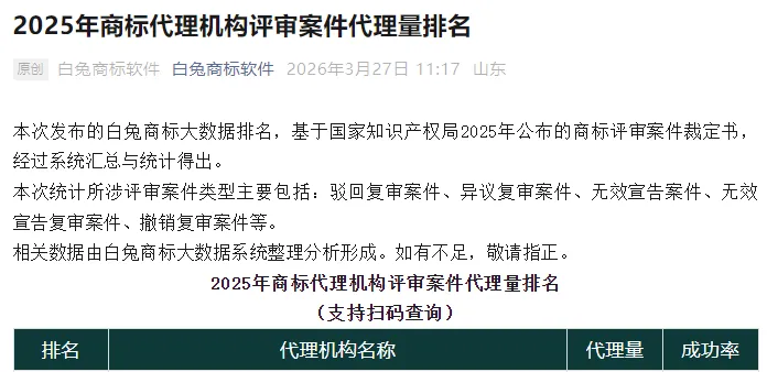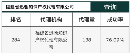 近日,白兔商标软件发布“2025年全国商标代理机构评审案件代理量排名”,福建省迅驰知识产权代理有限公司以138件的年代理量、76.09%的高成功率,在全国数万家商标代理机构中排名第284位。