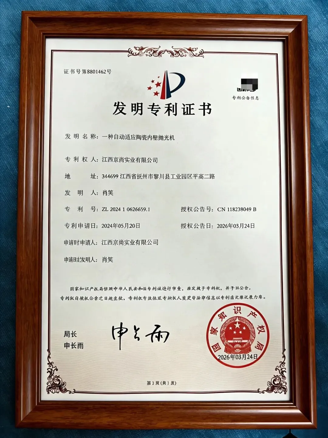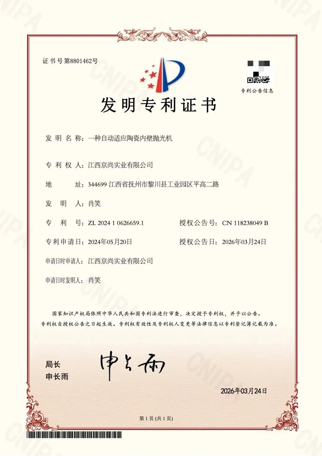 2026 年 3 月,国家知识产权局发布专利授权公告,坐落于 “中国煲都” 江西黎川的江西京尚实业有限公司,成功取得 “一种自动适应陶瓷内壁抛光机” 专利,授权公告号 CN118238049B。该专利于 2024 年 5 月提交申请,是企业在陶瓷加工设备领域的重要技术突破,也让这家陶瓷行业百强、科技五十强双料企业的科创版图再度扩容。