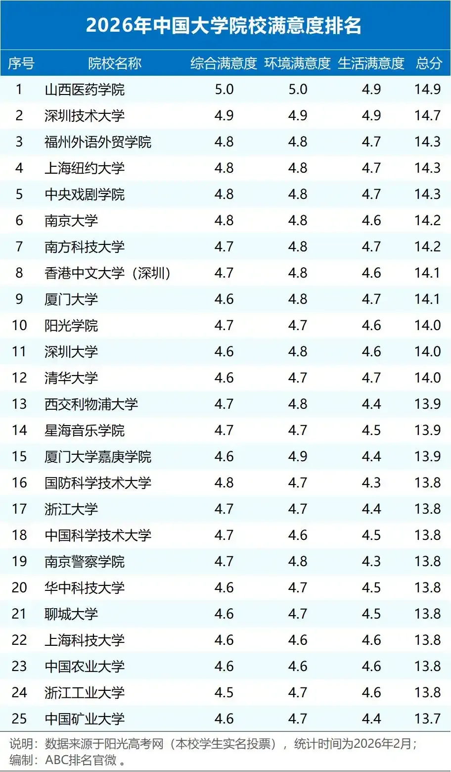 2026年中国本科院校满意度排名榜已经公布。本榜单是根据阳光高考网本校学生实名投票数据来制作的,是对在校学生对学校综合体验、校园环境、生活条件这三个方面直接评价的反映。与单纯依靠学术科研指标来排名的传统不同,本榜单更注重学生实际就读的感受,给公众提供了一个观察中国高等教育院校学生体验状况的新视角。
