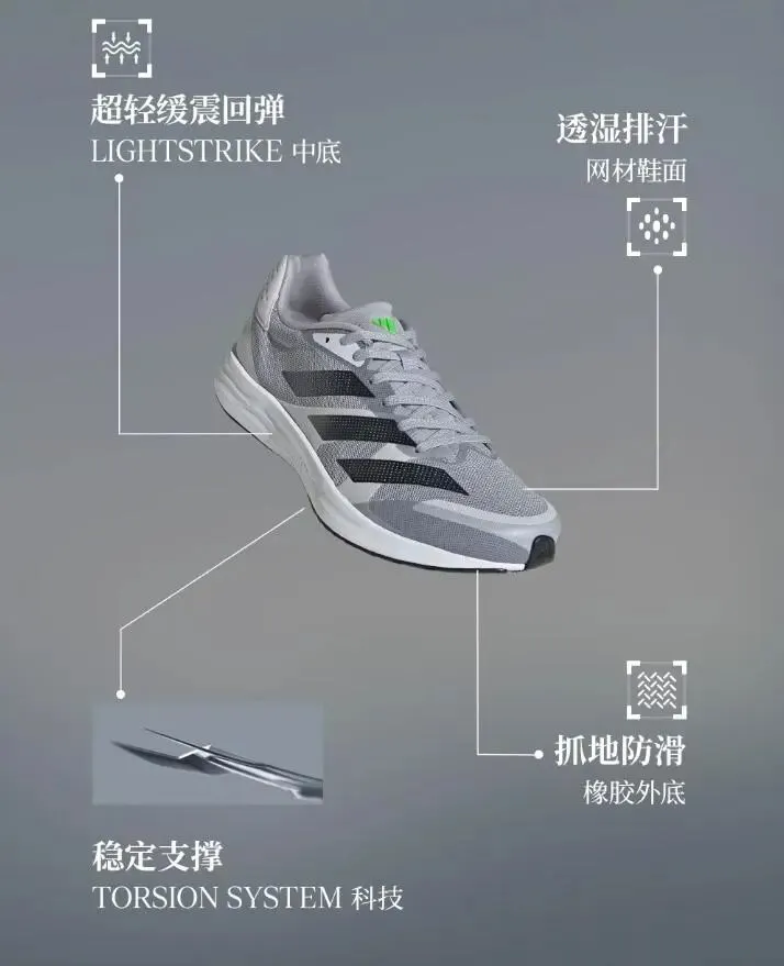 阿迪达斯这款adizero RC 4竞训跑鞋,白色、黑色、灰色三个配色,简约大气,适合训练、备赛、体测使用,专业度拉满。超轻设计是它的亮点,鞋身特别轻便,单只鞋重量很轻,跑起来没有负重感,能轻松提升配速,适合备赛、体测、日常训练使用。薄底设计,路感特别清晰,能准确感知地面反馈,帮助跑者调整跑姿,进阶跑者、体育生备赛穿,能有效提升训练效果。现在活动期间,满400减90,到手不到500,阿迪达斯的专业竞训跑鞋,这个价格真的很划算。