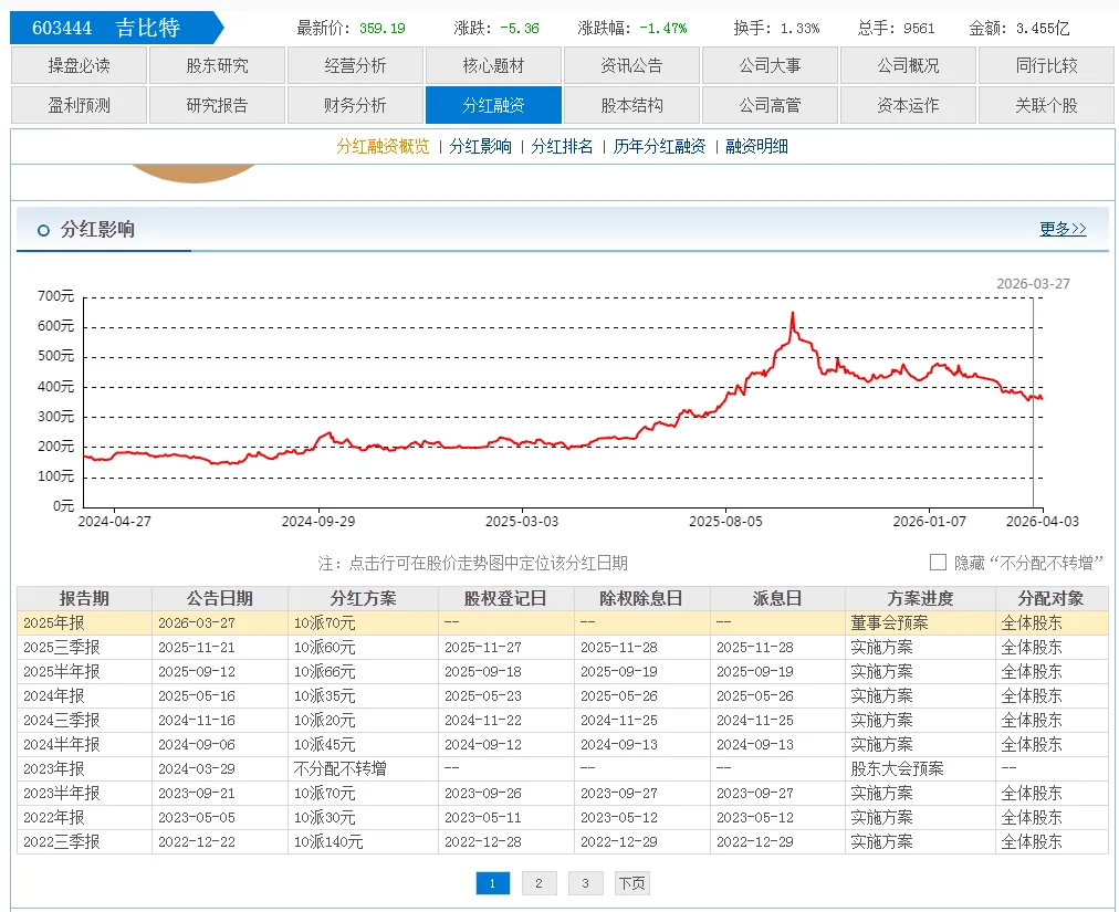 第一名:吉比特,每10股派发 70元。吉比特一直被称为“游戏茅”,高分红是它的老传统了,这次果然没让大家失望。