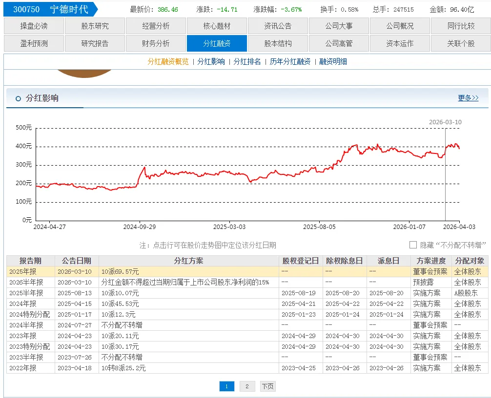 第二名:宁德时代,每10股派发 69.57元。电池一哥,名副其实。